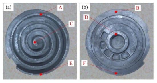 The macro morphology of the scroll obtained under the optimal process parameters (i.e., insulation temperature of 595 °C, squeeze pressure of 100 MPa) is shown in Figure 12. It was found that the scroll was fully filled, with clear outlines and smooth surfaces, without any obvious shrinkage, entrainment, cracks, mucosa, or any other common macro defects. The microstructure of different positions of the scroll labeled by A–F in Figure 12 is presented in Figure 13.
