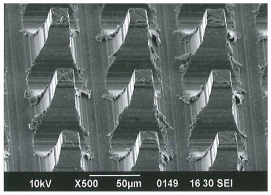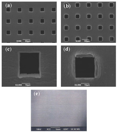 A uniform topography of a micrometer scale was created on the material by the machining work. Figure 3 shows SEM images of a microperforated Ti membrane after MPNP processing. The perforated aperture ratio was very high and almost complete penetration occurred. The shape of each hole was precisely uniform at 25 × 25 μm. All of the holes were arrayed at uniform intervals of 75 μm. The surface of the head side which was impacted by the MPNP tool and pierced by needles, remained smooth and an array of square holes was precisely formed. The cut edges of apertures was straight and sharp (Figure 3a,c). On the other hand, the shape of each hole on the aperture at the tail side was generally uniform at 25 × 25 μm, the penetrated part of the substrate was accompanied by irregularly shaped edges with burrs mimicking a “volcanic” shape (Figure 3b,d). The microperforation process with MPNP was successfully performed for the whole range of punching (Figure 3e).