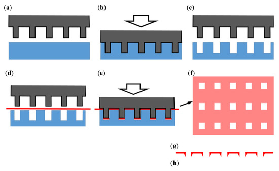 Processing steps for the microperforation of Ti sheets. (a) Fix a plastic resin plate on the workbench; (b) Compress MPNP into the plate; (c) Deform a die customized for engaging with MPNP; (d) Place a titanium sheet between MPNP and the die; (e) Punching; (f) The fabricated item after processing; (g) Head side; (h) Tail side.
