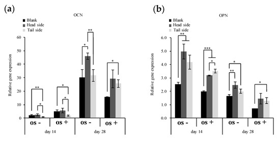 Relative gene expression of OCN (a) and OPN (b) on day 14 and 28. MC3T3-E1 cells on specimens were cultured in basal and osteogenic medium (OS). Real-time PCR data were calculated from independent samples (n ≥ 3). All values are shown as the mean ± standard deviation (n ≥ 3). All results were compared by a one-way ANOVA with Tukey’s test using SPSS Statistics 17. The results with p values < 0.05 were deemed to be significant (* p < 0.05, ** p < 0.01, *** p < 0.001); n.s., not significant (p > 0.05).