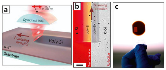 - Emelyanov, A.V.; Khenkin, M.V.; Kazanskii, A.G.; Forsh, P.A.; Kashkarov, P.K.; Gecevicius, M.; Beresna, M.; Kazansky, P.G. Femtosecond laser induced crystallization of hydrogenated amorphous silicon for photovoltaic applications. Thin Solid Film. 2014, 556, 410–413. [Google Scholar] [CrossRef]