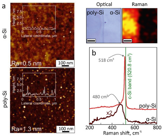Raman microspectroscopy was used to further probe crystallinity of the laser-annealed areas. Representative averaged Raman spectra of pristine -Si and poly-Si are shown in Figure 2c. If compared with untreated -Si film that only demonstrated a low-intensity broad Raman band centered at 480 cm, the laser-annealed poly-Si shows a sharp peak at 518 cm which is slightly shifted with respect to the reference Raman frequency of monocrystalline Si at 520.8 cm (shown by a vertical line in Figure 2c). This spectral shift is indicative of nanocrystalline Si phase with the estimated size of nanograins around ≈10 nm according to ref. [49]. Mapping the intensity of this Raman band (518 ± 4 cm) near the boundary between pristine and laser-annealed areas allowed us easily to separate poly-Si and -Si phase areas (see top insets in Figure 2c).