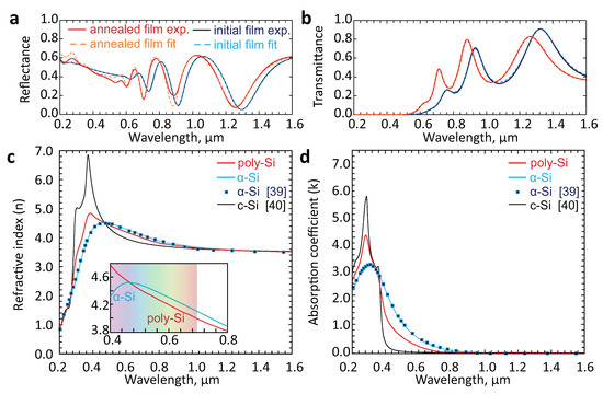 Based on the obtained reflection/transmission spectra, both the refractive index n and absorption coefficient k were further evaluated using common photometric approach [50,51] (see also Methods for details). The results of these calculations are summarized in Figure 3c,d along with the reference data for amorphous [52] and monocrystalline bulk silicon [53]. Noteworthy, the obtained dispersion curves for pristine -Si film perfectly fit the corresponding reference data [52], indicating correctness of the measurements and calculations. Also, transmission spectra obtained with such a numerical fit demonstrate excellent agreement with the experimental data (see dashed curves in Figure 3a). As seen in Figure 3, for the laser-annealed poly-Si film the absorption coefficient decreases twice in the visible spectral range. Its obtained refractive index also decreases with respect to that of the pristine film by about 0.1 refractive index units (RIU) in the visible spectral range (at wavelength >500 nm) and increases largely in the blue part of the spectrum, following the trend similar to dispersion curve for monocrystalline Si. These features are indicative for polycrystalline silicon and are generally consistent with the previously reported studies for laser-annealed films [54]. Systematic measurements of different sites on the surface of the poly-Si sample also indicated the average thickness of the annealed film to be of 360 ± 5 nm, which is close to that of the pristine -Si. A small decrease of the height may imply film shrinkage upon its annealing [55]. However, a similar height deviation was found by probing optical spectra for the pristine -Si. Also, AFM measurements carried out near the boundary between poly- and -Si (shown as inset in Figure 2c) reveal no detectable height modulations [56]. In this respect, the shrinkage cannot be reliably identified in our experiments.