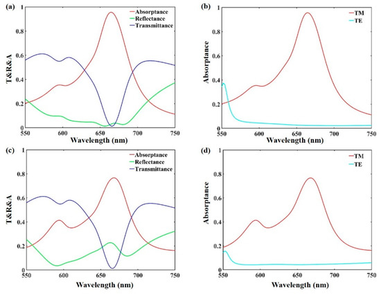 The absorption, transmission and reflection spectra of the designed bilayer grating structure under forward TM-polarized incidence are indicated in Figure 2a. The reflection curve is near zero and an obvious decline can be observed in the transmission curve, while an absorption peak with over 95% absorptance is obtained around 666 nm. Moreover, the near-perfect absorption of incident waves in the bilayer plasmonic metasurface is polarization-selective. Figure 2b presents the absorption spectra of the proposed metasurface under both TM- and TE-polarized incidence. It can be clearly found that there is an absorption peak under TM-polarized irradiation, while the absorptance under TE-polarized irradiation is near zero around 666 nm. Similarly, we calculate the absorption, transmission and reflection spectra of the designed bilayer grating structure under backward TM-polarized incidence, as shown in Figure 2c. The obvious drop is clearly visible in the transmission, and an absorption peak with over 77% absorptance appears around 666 nm. Compared to forward incidence, the incident light first illuminates on the wide metal grating array with backward incidence, which creates a stronger reflection effect (>21%) and weakens the absorption effect of the structure. Figure 2d shows the absorption spectra under both backward TM- and TE-polarized incidence. The absorption peak only exists under TM-polarized illumination, and the absorptance is near zero under TE-polarized illumination. This means that the designed structure has the function of polarization-selective bidirectional absorption.