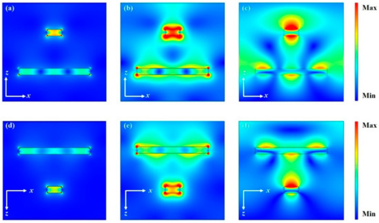 (a–c) Current density J, and electric and magnetic field distributions |E| and |H|, respectively, of the structure under forward TM-polarized light incidence. (d–f) Current density J, and electric and magnetic field distributions |E| and |H|, respectively, of the structure under backward TM-polarized light incidence.