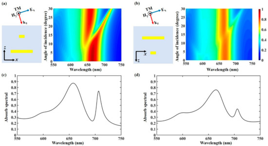 In addition, we investigate the influence of oblique incidence on the bidirectional absorption performance. Figure 6a indicates the simulation results of the absorption spectrum under forward TM-polarized incidence with different incident angles. It is obvious that a high absorption capability can be maintained at around 666 nm with the incident angle varying from 0 to 30°, which can be kept above 80%. A similar absorptivity can also be seen in the absorption spectrum under backward TM-polarized incidence, as shown in Figure 6b. The absorption is more than 70% within an incident angle up to 30°. Thus, the designed polarization-selective bidirectional absorber device can retain a great performance at a wide range of incident angles. It is worth noting that an absorption dip appears when the incident angle increases. The asymmetric absorption spectrum can be obtained when the incident angle is more than 9° (18°) under forward (backward) TM-polarized incidence, which shows an obvious characteristic of Fano-like resonance (an absorption rise close to an absorption peak). In order to clearly show the Fano-like resonance spectral, we plot the absorption spectral under the forward and backward oblique TM-polarized light at the incident angle of 25°, as shown in Figure 6c,d. According to the previous publications, the Fano-like resonance is induced by the interference and spatial overlap between continuous radiative resonance (bright mode) and nonradiative resonance (narrow dark mode) [28]. The Fano-like resonance in the designed structure is caused by the interference between the wide continuous spectrum resonance mode and the narrow dark resonance mode. The wide continuum resonance mode is the SPPs resonance mode of different orders on the metal grating surface, and the narrow dark resonance mode is caused by the asymmetry of the charge distribution in the metal slit. The light diffraction order is increased with the increase of the incident angle, and the symmetrical distribution of the enhanced electromagnetic field is gradually broken [29]. The left absorption peak corresponds to a continuum SPPs resonance mode with different orders on the bilayer grating, and the right narrow absorption peak is induced by the asymmetric charge distribution in the metal grating slit [30]. Therefore, the presented bilayer grating structure can maintain the function of polarization-selective bidirectional absorption within an incident angle up to 30°. The excited Fano-like resonance mode of the absorber at oblique incidence is conducive to the optical sensing application [29,30,31,32,33,34].