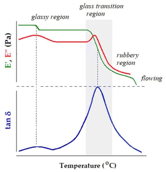 A schematic representation of the E’ modulus vs. T for an amorphous PLA adapted after these publications is presented in Figure 2.