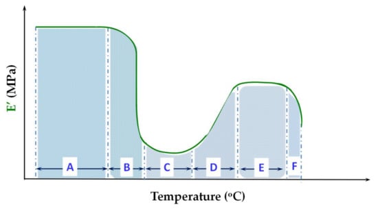 Evolution of the elastic modulus E’ with temperature for PLA at 1 Hz. The delimited zones are A—the glassy region; B—the glass transition region; C—the first rubbery plateau; D—the region of cold crystallization; E—the second rubbery plateau; F—the flowing region. Adapted from reference [57], with permission from Elsevier. Copyright 2020.
