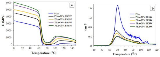 Evolution of elastic modulus E’ (a) and loss factor tan δ (b) with temperature for PLA composites reinforced with increasing quantities of bleached kraft soft woods (BKSW). Reproduced from [63], with permission from Elsevier. Copyright 2020.
