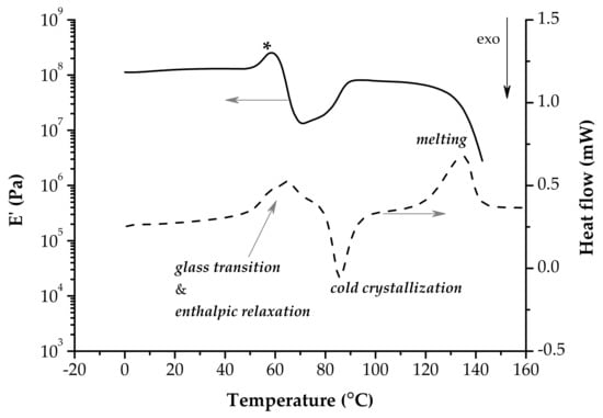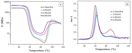 Composites of PLA/talc [67], mentioned and discussed already in Section 4.1., feature the cold crystallization firstly as a more evident change of slope of E’ vs. T curve, for low talc content (Figure 4a—neat PLA and PLAT1). This is reflected also as a second smaller peak on tan δ curve (Figure 4b).