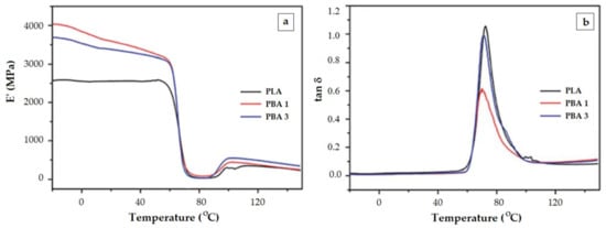 The temperature dependence of the elastic modulus E’ (a) and of the loss factor tan δ (b) for PLA nanocomposites with organic-inorganic hybrid material (aluminium hydroxide—ATH and benzenephosphinic acid—BPA) as filler; filler content PBA1—10 wt%, PBA3—20 wt%. Reproduced from [66], with permission from The Royal Society of Chemistry. Copyright 2020.
