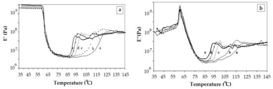 However, most often the glass transition peak and crystallization peak/shoulder are not separated. They are reunited in an askew peak, with the downward side less abrupt (Figure 3b and Figure 5b) as was reported by Espinach et al. and Yazdaninia et al. in the examples mentioned in Section 4.1 [63,64]. The E’ first rubbery plateau (zone C, Figure 2) is clearly emphasized in these two systems.