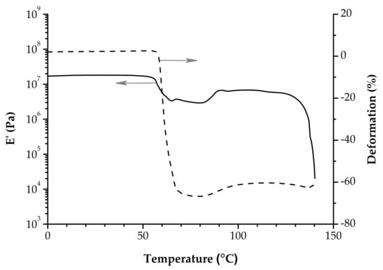 What cannot be overlooked when dealing with physical aging is the thermal shrinking during the glass transition [86]. This affects significantly the viscoelastic behavior in this region, and the polymer becomes stiffer. Pluta and Galeski reported that the Tg determined in a DMA experiment (tan δ peak) performed on poly(L/D,L-lactide), deformed to different ratios, can be higher than in reality [71]. Experiments of thermomechanical analysis (TMA) emphasized the dimensional change of PLA samples as the temperature increased [63,87,88]. Nevertheless, even a DMA instrument registers the position of the drive shaft in real time, making possible to follow the evolution of the sample length during a tension experiment. Shrinking of non-woven PLA fabrics (Figure 8) [69] and of L-lactide/glycolide/trimethylene carbonate terpolymers [89] were recorded during DMA investigations in the glass transition zone.