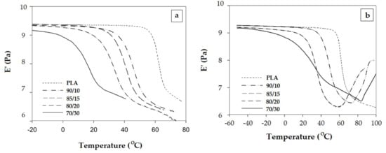 It is interesting to observe the E’ vs. T plot represented in Figure 10b. Seemingly, the behavior of the 70/30 PLA/PEG blend could be interpreted as an exception, since the increase of E’ associated with the cold crystallization appears at the highest temperature. Actually, the slope change that overlaps/follows the glass transition is the real onset of crystallization that occurs slowly at the beginning. The other two PLA/PEG mixtures (90/10 and 80/20) display the V-shape variation of E’ vs. T curves in the regions glass transition-cold crystallization.