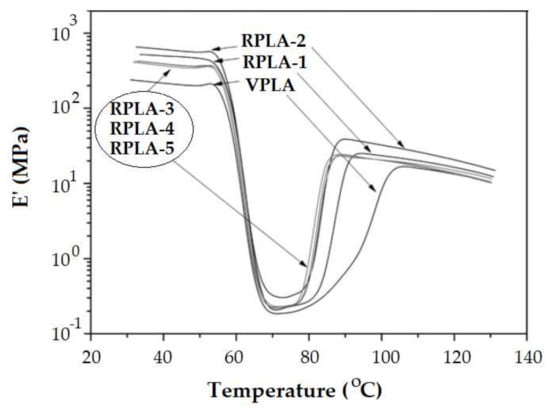 Evolution of the elastic modulus E’ at 1 Hz for virgin polylactide (VPLA) and mechanically reprocessed polylactides: RPLA-1 (one recovery cycle); RPLA-2 (two recovery cycles); RPLA-3 (three recovery cycles); RPLA-4 (four recovery cycles); RPLA-5 (5 recovery cycles) [57]. Reproduced with permission from Elsevier. Copyright 2020.