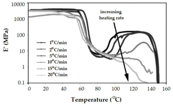 The heating rate is a critical experimental condition when working with DMA mainly because the method uses quite big samples. This is why small heating rates are required to avoid thermal heterogeneities and high thermal lag between the sample and the thermocouple. When physical or chemical processes take place during the DMA experiment, the heating rate becomes more important [51]. Tabi et al. demonstrated how the rise of the heating rate changes the DMA behavior of PLA [35]. With increasing heating rate the cold crystallization becomes less important (Figure 12). Actually, the polymer does not have enough time to crystallize at very high heating rates (15 °C/min and 20 °C/min) and its DMA behavior looks like that of a standard thermoplastic elastomer.