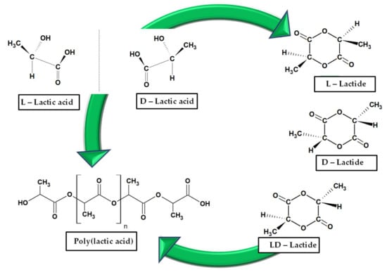 In the world of polymers the pursuit of new materials, intended to solve one or another issue in a specific domain, is analyzed from the point of view of both environmental and economic sustainability. In this regard there are criteria for sustainability connected with the influence on the health of any form of life, with the waste that accumulates in the environment or with the greenhouse effect. Moreover, the costs of all processes have a conclusive role. Despite various views and counterviews related to the sustainable materials, the interest in this field is growing and the market evolves accordingly [1,2,3]. Poly(lactic acid) (PLA) has made a large contribution in the area of bio-polymers: it is biobased, biodegradable/compostable and biocompatible [4,5,6,7]. The starting compound (lactic acid or lactide) is the result of the fermentation of renewable resources (crops like corn, rice or sugarcane). Moreover, degradation occurs under the action of microorganisms and yields products (CO2 and H2O) that represent valuable compounds for nature. PLA compostability represents a benefit especially when circumstances are disadvantageous for recycling. Poly(lactic acid)—structurally defined as a linear aliphatic thermoplastic polyester—is considered to belong to the third-generation of biodegradable polymers due to its suitable biodegradable and mechanical properties [8].