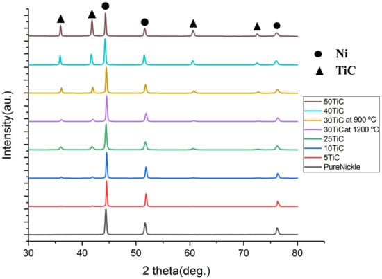 XRD graph and peak index of Pure Ni, Ni-5TiC, Ni-10TiC, Ni-25TiC, Ni-30TiC at 900 °C, Ni-30TiC at 1200 °C, Ni-40TiC and Ni-50TiC.