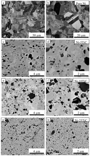 Scanning electron microscopy images of spark plasma sintered (a,b) Pure Ni, (c,d) Ni-5TiC, (e,f) Ni-10TiC, and (g,h) Ni-25TiC.