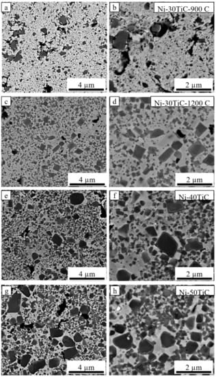 Scanning electron microscopy images (a,b) Ni-30TiC at 900 °C, (c,d) Ni-30TiC at 1200 °C, (e,f) Ni-40TiC, and (g,h) Ni-50TiC Composites.