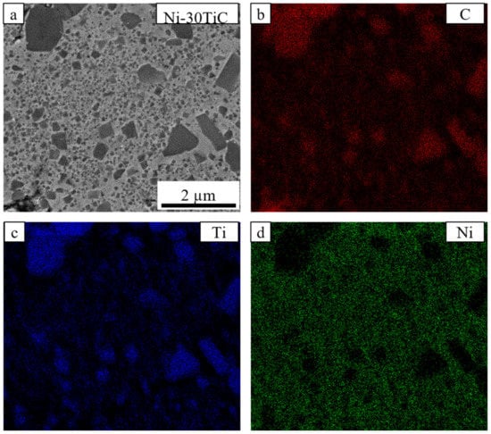 Figure 2 and Figure 3 shows backscattered SEM images of spark plasma sintered pure nickel and Ni-TiC samples with varying wt.% of TiC reinforcement. Pure nickel exhibits a uniform grain structure with 98.2% relative density and average grain size of 33 μm. The full and rapid densification of powder compacts without any substantial grain growth is one of the major advantages of SPS processing that is a result of sintering by joule heating and the spark plasma generated by the pulsed, high electric current passing through the compact. All Ni-TiC composites (Figure 2c–f and Figure 3) exhibits the TiC phase (black particles) in addition to the grey nickel matrix. All TiC particles are uniformly distributed within the nickel matrix. Figure 4 shows the SEM-EDS map of Ni-30TiC, where black particles are enriched in Ti and C and depleted in Ni, which corresponds to the TiC phase, which is consistent with XRD results. All TiC particles are uniformly distributed within the nickel matrix in all Ni-TiC composites. Mechanical alloying significantly helped minimize TiC particle sizes since particle sizes are very small in SPS processed Ni-TiC composites compared to starting particle size. SEM images clearly showing an increase in the volume fraction of the TiC phase with increasing TiC wt.% in these Ni-Tic composites. Additionally, with increasing TiC wt.%, there is a decrease in grain sizes of pure nickel since increasing volume fraction of TiC leads to an increase in the number of nucleation sites for pure nickel during recrystallization. It has also been observed that Ni-30TiC sintered at 900 °C has a smaller grain size of pure nickel as well as TiC with some porosity as compared to the sample sintered at 1200 °C. The higher sintering temperature leads to the coarsening of both nickel and TiC sizes but improves densification. Figure 4a–d shows the SEM image of Ni-30TiC sintered at 900 °C and 1200 °C, due to lack of sintering temperature, the Ni-30TiC-900 °C sample hasn’t sintered properly and exhibits porosity, compared to the Ni-30TiC-1200 °C sample that sintered properly without any porosity. Therefore, it has been found that with increasing TiC content in these composites, sintering temperature should increase for better consolidation. Thus, all samples with TiC content higher than 30 wt.% have been sintered with 1200 °C.