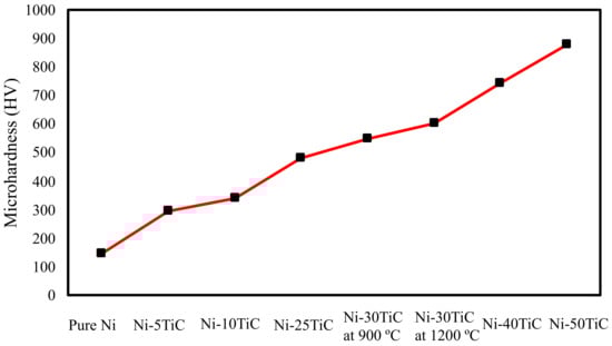The Vickers micro-hardness values for the pure nickel and all Ni-TiC composites have been plotted in Figure 5 and also listed in Table 2. The micro-hardness of SPS Processed pure nickel is 147.2 HV, which is lower than all Ni-TiC composites. Ni-5TiC composites exhibit microhardness of approximately 300 HV, which is double compared to that of pure nickel. Therefore, it is clear that TiC reinforcements help reduce the grain size of pure nickel and significant improvements in micro-hardness. Ni-TiC composites microhardness increases very linearly with an increase in TiC content and reaches maximum value up to approximately 900 HV with the addition of 50 wt.% TiC. The Ni-30 TiC sample sintered at 900 °C shows lower microhardness than the specimen sintered at 1200 °C. The improvement in microhardness was observed due to the improvement in the samples’ densification at higher temperatures. Abderrazak et al. [] reported that the hardness of TiC is 2700 HV after 20 hr of MA followed by consolidation using SPS processing at 1650 °C. The Vickers microhardness of MA TiC compacted using plasma-activated sintering was found to be approximately 3200 HV []. El-eskandarany and A. Teber et al. [,] stated that microhardness of TiC sintered at 16,500 C and 100 MPa using SPS processing is 2700 HV and 2450 HV with 5 min and 10mins of holding time, respectively, and drop in hardness due to coarsening of grains at higher temperatures. The increase in hardness correlating with the increase in sintering temperature is consistent with other authors that used SPS to produce TiC based composites [,].