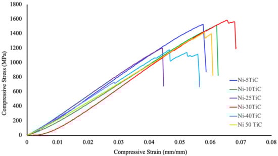 Figure 6 show compressive stress versus strain plots for Ni-TiC composites with different weight fractions of TiC, and the mechanical properties (compressive yield strength, ultimate compressive strength, and fracture strain) of the composites are summarized in Table 2. As we can see from the plot, due to TiC reinforcement’s addition, compressive strength has been significantly improved compared to pure nickel. All Ni-TiC composites exhibited almost three times higher compressive strength as compared to pure nickel. Ni-30TiC composites exhibited the highest ultimate compressive strength as compared to other Ni-TiC composites. As the weight fraction of TiC increases, the compressive strength of Ni-TiC composites increases by up to 30 wt.%. However, as TiC wt.% increases beyond 30%, for Ni-40TiC and Ni-50TiC composites, compressive properties started decreasing. This might be due to the presence of porosities in Ni-40TiC and Ni-50TiC composites sintered at 1200 °C and requires a higher temperature to achieve full densification. The authors have limited the sintering temperature to 1200 °C due to the lower melting temperature of pure nickel and to avoid any melting during SPS processing. This significant increase in strength of SPS processed Ni-TiC composites can be attributed to (a) the incorporation of TiC particles that has higher strength and modulus, (b) the grain size refinement due to the addition of TiC particles within nickel matrix, (c) increase in dislocation density to accommodate the difference between the coefficient of thermal expansion (CTE) between TiC particle and nickel matrix, and (d) thermal stability and excellent interfacial bonding between TiC particles and nickel matrix. The Ni-TiC composites exhibited significant refinement in nickel grains as compared to pure nickel due to the addition of TiC particle prevent grain growth during the sintering process (Figure 2 and Figure 3). TiC particle addition into the nickel matrix significantly increases dislocation densities in Ni-TiC composites due to the large CTE difference between TiC reinforcements and nickel matrix. Additionally, the possibility of the strengthening of nickel matrix through elastic strain resulting from CTE mismatch or due to load transfer from TiC particles to nickel matrix during deformation must be considered. TiC reinforced metal matrix composites have gained lots of attention due to the excellent thermal stability of TiC within the metal matrix and significant enhancement in hardness and strength to weight ratio of TiC reinforced MMCs. In the compressive stress-strain graph, we have observed a sudden drop in stress during compression testing, particularly in Ni-TiC composites with higher TiC wt.% (Ni-30TiC to Ni-50TiC). Few researchers observed similar behavior in ceramic reinforced composites primarily due to formation and unstable micro-crack propagation, [,,]. The composites exhibited repeated crack initiation and arrest behavior, suggesting an excellent toughening effect from the interaction between the crack tip and the microstructure. These cracks bowing and deflection toughening mechanism have been proposed to increase toughness in some ceramic based systems and ceramic reinforced composites. We have also observed that the TiC wt.% and sintering temperature play an important role in governing microstructure and the resulting mechanical properties of these Ni-TiC composites. As TiC wt.% increases in Ni-TiC composites, the higher sintering temperature is required to achieve full densification and excellent mechanical properties. Therefore, Ni-TiC (5–25 wt.%) composites have been sintered at 900 °C and as TiC content increase further (30–50 wt.%), these composites have been sintered at 1200 °C.