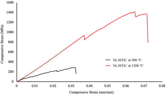 The compressive stress versus strain plot for Ni-30TiC composites sintered at 900 °C and 1200 °C is shown in Figure 7. The Ni-30TiC composites sintered at 1200 °C exhibited almost five times higher ultimate compressive strength as compared to Ni-30TiC composites sintered at 900 °C. This significant improvement in compressive properties is primarily due to improvement in the densification of Ni-30TiC composites sintered at 1200 °C where the load has been effectively transferred from nickel matrix to TiC reinforcement due to good interfacial bonding between TiC particles and nickel matrix. Due to porosity as well as weak interfacial bonding between TiC particles and nickel matrix, Ni-30TiC sintered at 900 °C composites exhibited very poor compressive behavior.