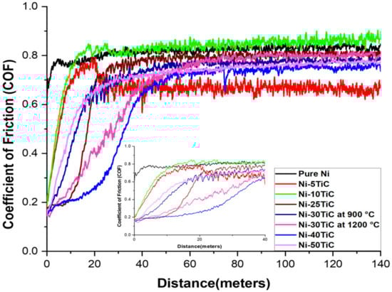 On the other hand, Ni-50TiC shows significantly less surface wear and minimum counter-body material detected over the track than all different samples. TiC is a harder material, and Ni-TiC composites showing less wear due to the presence of TiC increases the load-bearing capacity []. The flaking wear phenomena have been observed in pure nickel and Ni-5TiC samples, whereas micro ploughing wear phenomena have been observed in Ni-30TiC and Ni-50TiC composites due to the higher content of TiC in these composites. The TiC has a higher hardness than the rotating Si3N4 ball, causing a micro ploughing wear mechanism []. The wear resistance of Ni-TiC composites shown significant improvement than pure nickel. The friction coefficient remains approximately 0.2 to 0.4 until the initial 20 m of the sliding distance, and then it increases drastically due to high friction. The presence of TiC into the nickel matrix significantly affects the wear behavior of these composites.