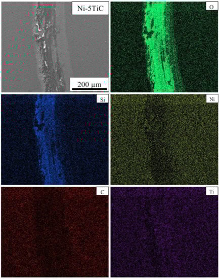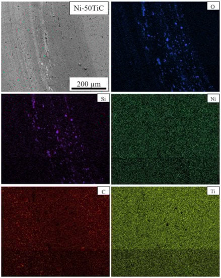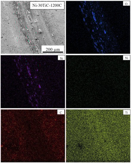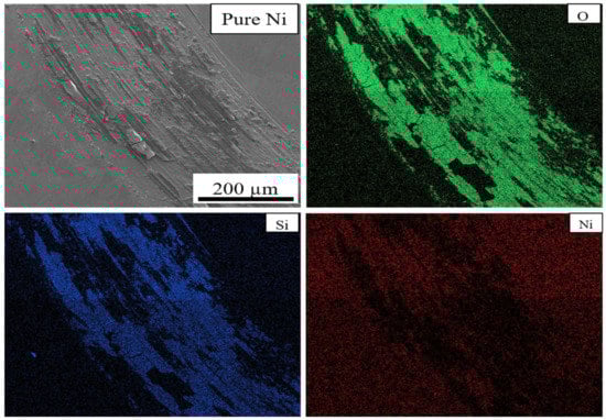 SEM micrographs and EDS maps of the pure Ni and Ni-TiC composites after the tribotesting are illustrated in Figure 9, Figure 10, Figure 11 and Figure 12. The continuous grinding structure has been noticed throughout the track in a moving direction. The wear track consists of flaking like wear debris and scratches over the track indicating abrasive wear mechanism in Ni-TiC composites. Outside edges of the wear track exhibited wear debris; also, the Si3N4 ball wear has been observed during the wear testing. A tribolayer formed over the sliding track gives a strong indication of material transfer between the grinding surfaces. EDS map clearly shows the presence of silicon and oxygen along the wear track, indicating two to three-body abrasive wear mechanisms. In three-body wear phenomena, wear debris caught in-between the sliding surfaces, leading to the formation of tribiolayer over the sliding path; this similar mechanism is observed in the tribochemical wear. The chips and cracks and the highest silicon and oxygen presence over the sliding path revealed in EDS maps of pure nickel wear track shown in Figure 9. Nickel is a softer material and has a lower hardness result in adhesive wear of pure nickel. At the same time, an increasing weight percentage of TiC in Ni matrix reduces the chipping. As TiC content increases in Ni-TiC composites, decreases in silicon deposition on the track have been observed (Figure 10, Figure 11 and Figure 12). Due to the lower hardness of pure nickel compared to Ni-TiC composites, pure nickel exhibits the highest adhesive wear and detected deep grove and flaking. These observations show pure nickel has the highest wear rate than Ni-TiC composites.