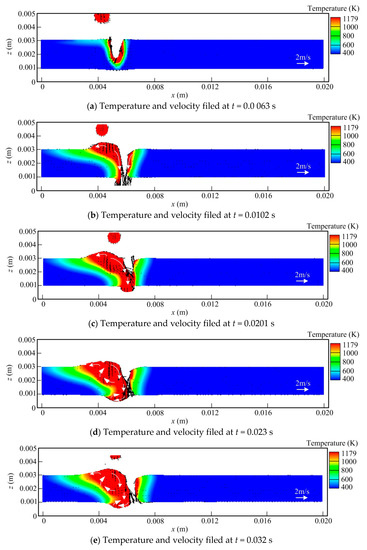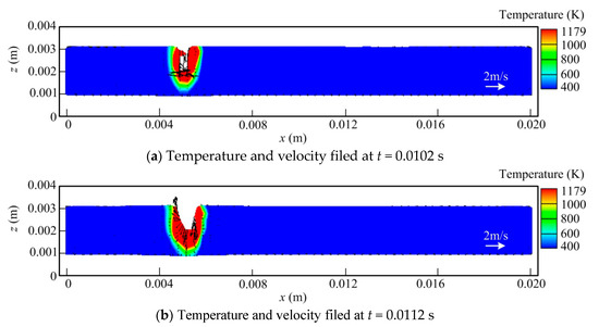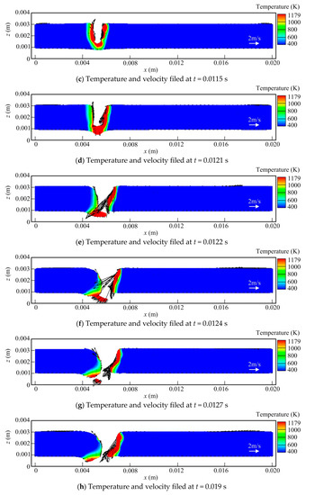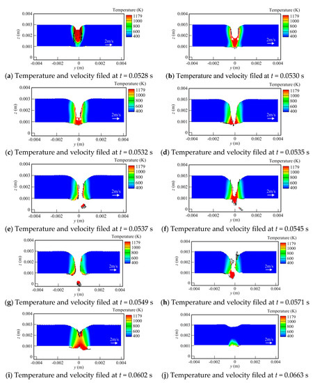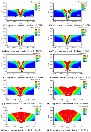 Figure 4i, it is seen that with the heat source moving forwards, the keyhole is filled by the molten metal. While the liquid metal pool is completely solidified, a depression of the weld top surface occurs, and a ditch is also generated at the weld bead back owing to the volume shrinkage of the liquid metal. Here, it should also be pointed out that during the welding process, the temperature and velocity profiles are not symmetrical strictly due to its complex dynamic behavior. Meanwhile, the solidification of the weld pool at the workpiece surface is later than that at the workpiece top surface, as shown in