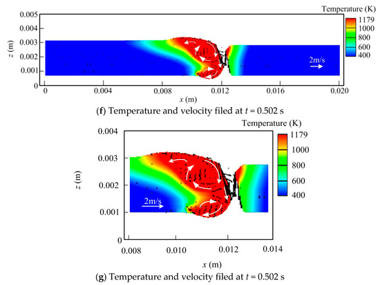 Figure 6g. Meanwhile, a small vortex occurs at each side. This flow pattern helps enlarge the contact area of the liquid metal and solid interface, thus also inhibiting the dripping of liquid metal to some degree. Thus, compared with that in laser welding, this relatively stable metal bulge tends to reduce the risk of generating the defect at the weld root. At