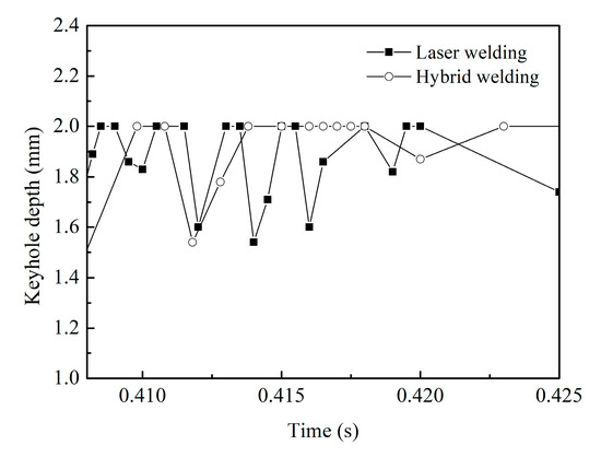 Figure 7 compares the evolution processes of the keyhole depth between the laser and hybrid welding processes. Although the keyhole still has a dynamic fluctuation in full penetration hybrid welding, its collapse frequency is reduced greatly compared with that in single laser welding, thereby contributing to the suppression of welding defects and the resultant improvement of weld formation at the workpiece backside. As expected, this phenomenon should be firstly ascribed to the preheating of the base metal by the arc. In hybrid welding, the laser acts in the liquid metal pool caused by arc directly, and the evaporation of the metal needs less laser energy compared to that in single laser welding. Thus, the keyhole is generated more easily in hybrid welding. Meanwhile, as mentioned above, both arc pressure and droplet impingement force strengthen the downward flow of the liquid metal on the rear keyhole wall, which also makes some contributions to the keyhole stability at the weld root. In addition, it can also be found in