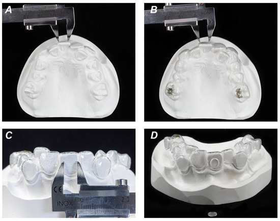 Preparation of orthodontic aligners used in the study. Conventional orthodontic plaster models were ground plane in the region of buccal areas. Required diameter of 6 mm of flat surface was confirmed by a conventional orthodontic caliper (A). Flat aligner surface of 6 mm equivalent to buccal plaster cast surface (B,C). Discs of 6 mm in diameter were cut out of regions with flat crown surfaces and used in cell culture experiments (D).