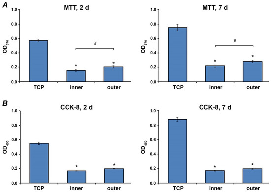 Proliferation/viability of Ca9-22 cells grown on different surfaces. Ca9-22 cells were cultured on TCP, inner and outer aligners’ surfaces. Proliferation/viability was measured after two and seven days incubation by MTT (A) and CCK-8 (B) assays. Cells grown on tissue culture plastic served as control. Y-axis represents the optical density (OD) measured at 570 nm and 450 nm. Data represents mean ± s.e.m. of four independent experiments. *—significantly lower compared to control; #—significantly different between groups. p < 0.05.