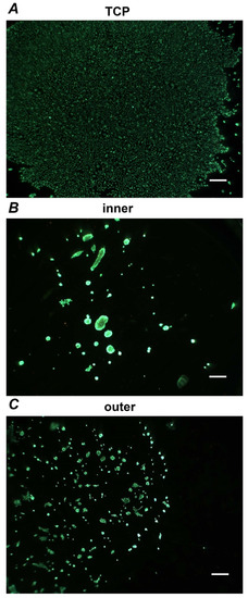 Live/dead Staining. Ca9-22 cells were grown on TCP (A), inner (B) and outer (C) aligners’ surfaces for seven days and stained with Live/dead staining kit. Vital cells are visible as green while the dead cells are presented red. Images are taken from representative experiment. Scale bar correspond to 500 µm.
