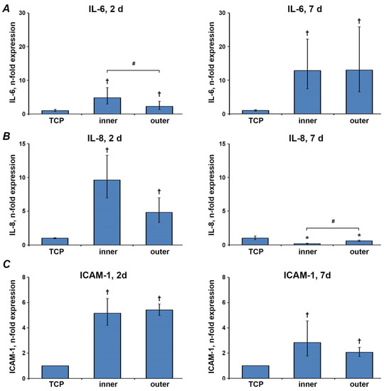 Gene expression of inflammatory markers. Gene expression of IL-6 (A), IL-8 (B) and ICAM1 (C) after two and seven days in Ca9-22 cells grown on different aligners’ surfaces were measured by qPCR. Y-axes represent n-fold expression in relation to Ca9-22 cells grown on TCP (n-fold expression = 1), calculated using 2−ΔΔCt method. Data are presented as the mean ± s.e.m. of four independent experiments. †—significantly higher compared to control; *—significantly lower compared to control; #—significantly different between groups. p < 0.05.