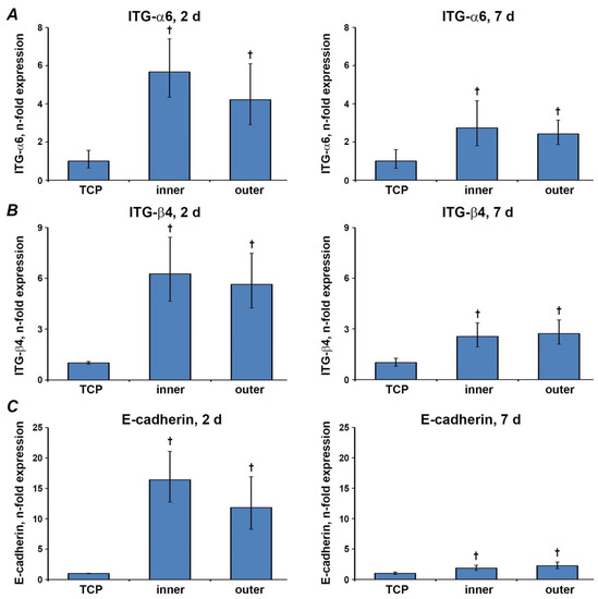 Gene expression of epithelial barrier markers. Gene expression of ITGα-6 (A), ITGβ-4 (B) and E-cadherin(C) after two and seven days in Ca9-22 cells grown on different aligners’ surfaces and TCP were measured by qPCR. Y-axes represent n-fold expression in relation to Ca9-22 cells grown on TCP (n-fold expression = 1), calculated using 2−ΔΔCt method. Data are presented as the mean ± s.e.m. of four independent experiments. † Significantly higher compared to control; p < 0.05.