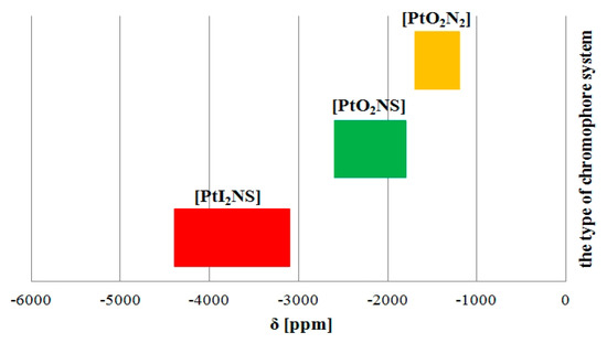 Nevertheless, the type of chromophore system present in the coordination sphere of (1–4) can unequivocally be determined based on their 195Pt resonances. 195Pt NMR spectra of the compounds exhibited one signal between −2598 and −2609 ppm (Table 3). There were shifts in this signal towards higher fields in comparison with that of K2PtCl4, and that could be assigned to [PtNO2S] coordination for platinum(II) (Table 3). The observed presence of single resonance signals indicated monodentate structures of the novel coordination complexes. These results were in good agreement with those of previous studies [23,25]. Similar results of 195Pt NMR data were obtained by Reedijk for chloride and cyclobutane-1,1-dicarboxylato platinum(II) complexes containing DMSO as a non-leaving group. 195Pt singlets for cis-[PtCl2(A9pyp)(DMSO)] and [Pt(CBDC)(A9pyp)(DMSO)] were observed at −3010 ppm [PtCl2NS] and −2498 ppm [PtO2NS] [23]. Moreover, similar values of the 195Pt chemical shift for complexes with two types of dicarboxylato ligands clearly confirmed that both the mal and CBDC leaving groups formed six-membered chelate rings upon complexation. The signals for previously synthesized [Pt(mal)(DMSO)(dmtp)], [Pt(CBDC)(DMSO)(dmtp)], [Pt(mal)(DMSO)(dptp)] and [Pt(CBDC)(DMSO)(dptp)] were observed in the same range of chemical shifts. Furthermore, previous studies from the Łakomska research group provide information that 195Pt NMR resonances of the diiodido platinum(II) complex cis-[PtI2(dbtp)2] were observed at much higher fields, i.e., −3261 ppm [PtI2N2], than were observed for its analogue [Pt(C4H4O5)(dbtp)2] containing dicarboxylato in the coordination sphere, −1740 ppm [PtO2N2], and for its chloride analogue cis-[PtCl2(dbtp)2], −2096 ppm [PtCl2N2] [39,44]. Additionally, signals from the trans-[PtI2(dbtp)(DMSO)] complex were observed at higher fields: −4389 ppm [PtI2NS] [40]. Moreover, the chloride analogue trans-[PtCl2(dbtp)(DMSO)] exhibited a single peak at −2955 ppm [PtCl2NS] [45]. Exactly the same trends were observed for the malonato platinum(II) complex [Pt(mal)(ibmtp)2]. 195Pt singlet signals were found at −1681 ppm [PtO2N2], while resonance signals of parent diiodido cis-[PtI2(ibmtp)2] were recorded at higher fields: −3243 ppm [PtI2N2] [22,38]. The above-mentioned data obtained by the Łakomska research group could be used to explain general trends in shielding during 195Pt NMR (Figure 2).