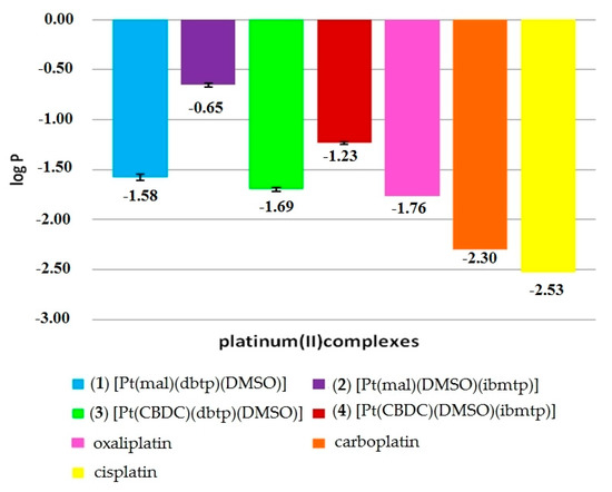 The lipophilicity of the investigated compounds increased in the order of (1) < (3) < (4) < (2) (Figure 4). These values can be compared with data available in the literature for currently used inorganic platinum(II) drugs, namely, cisplatin (−2.53), carboplatin (−2.30) and oxaliplatin (−1.76) [52]. It is important to note that that all studied platinum(II) complexes exhibited increased lipophilicity in comparison to those of all three international anticancer drugs.