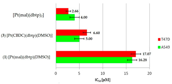Our previous [22] and current in vitro results agree with two main mechanistic assumptions concerning the design and synthesis of novel platinum(II) drugs. First, replacement of the leaving group influenced the activity by pharmacological properties. Second, adding an appropriate carrier group to a transition metal can grant more favorable DNA binding properties [57]. Such a tendency can be observed among the activities of our dicarboxylato platinum(II) complexes (Figure 5). On the one hand, substitution of the mal ligand by the CBDC group increased the activity. On the other hand, substitution of one of the 5,7-ditertbutyl-1,2,4-triazolo[1,5-a]pyrimidine carrier ligands by the DMSO molecule slightly decreased the in vitro cytotoxicity. This can be explained by the relatively low capacity of interaction between bases in DNA and DMSO. Bulky ligands such as 5,7-ditertbutyl-1,2,4-triazolo[1,5-a]pyrimidine possess a higher capacity to increase the intercalation with DNA than the smaller DMSO molecules. Such a tendency is revealed in results against non-small cell lung carcinoma (A549) and breast cancer (T-47D) cells.