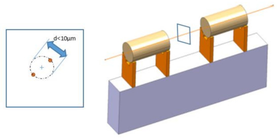 The components are arranged on the beams. Their external reference surfaces are mounted on V-shaped supports. Their central axis (corresponding to the theoretical axis of movement of the particle beam) is included in a cylinder with a radius of 5 µm for each beam.