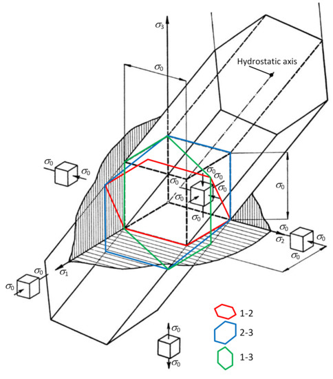 The particular geometric shape of the plasticity area in the three-dimensional space of principal stresses depends on the theory applied to the plasticity condition. In the case of shear stress stability (von Mises), the plasticity condition is expressed by the limit cylindrical area of plasticity. In the case of maximum shear stress stability (Tresca), the plasticity condition is expressed by the boundary area of the regular hexagonal prism of plasticity (see Figure 3). is the relevant critical stress (yield strength of the material). Three spatial limit hexagons of plasticity 1-2, 2-3 and 1-3 as the intersections of the limit prism of plasticity and three coordinate planes are also marked in Figure 3. The axis of the respective area is identical to the so-called hydrostatic axis which passes through the origin of the coordinate system and is equidistant from all three major axes [24,25,26,27,28,29].