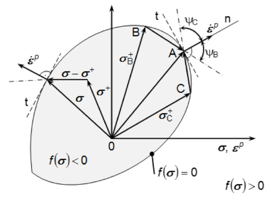 Depending on the convexity condition, the loading or plasticity area decomposes on one side of its tangent plane and is therefore convex. Depending on the normality condition at the regular points of the loading area, the plastic deformation velocity vector is normal to the loading area [13,35,36,37,38,39].