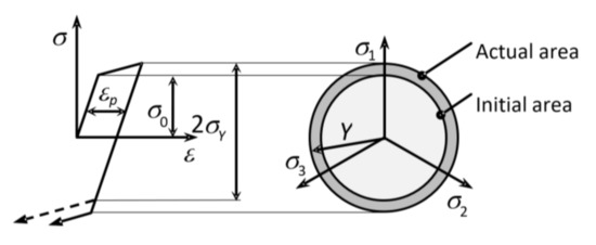 The previous relationships determine the general reinforcement condition and the function of hardening which determines the subsequent loading area during plastic deformation. They can be further modified for specific cases to accurately describe individual modifications of material models, e.g., a thermoplastic or elastic–plastic material, either with or without deformation hardening, etc. [56,57,58,59,60]