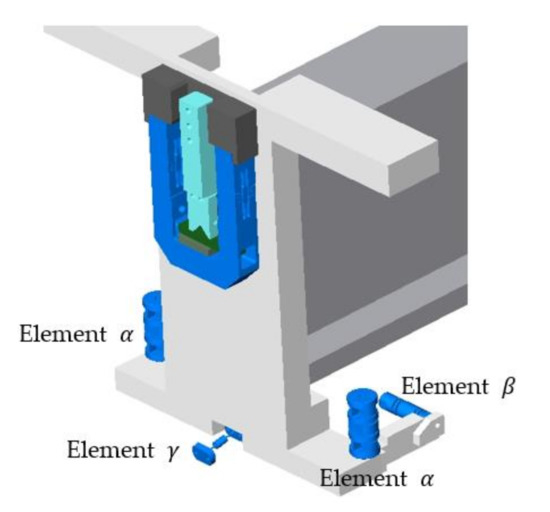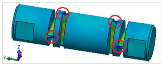 Virtual objects of these analyses were a group of structural elements—universal joints in the form of elastic elements, internally designated as α, β, γ, Figure 7, Figure 8, Figure 9 and Figure 10. Real models of these elements were developed by ZTS VVÚ Košice (Košice, Slovakia) and they are part of a positioning device on the Compact Linear Collider of the European Organization for Nuclear Research (CERN).