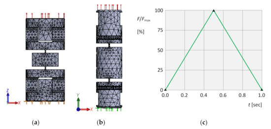 The elements are made of material 34CrNiMo6 with basic material properties: the Young’s modulus , the Poisson’s ratio 0.3, the yield stress , the tensile strength . For this group of simulations, meshing, boundary conditions and load of the virtual object were chosen (Figure 11a,b) with the time-dependent chart of loading according to Figure 11c. In all computations, the size of elements in critical points (e.g., notches) was approximately 0.1 mm. For meshing, parabolic tetrahedral solid elements were used.