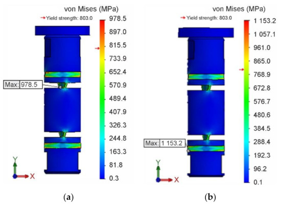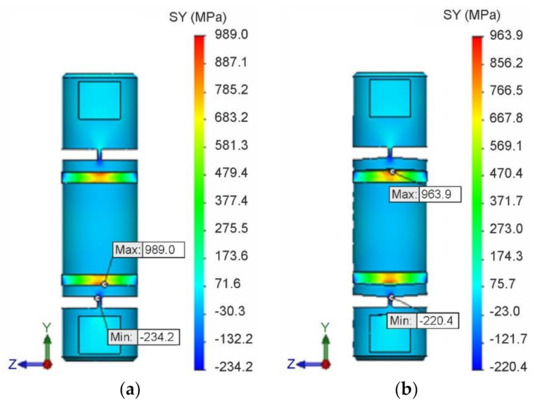 The field of equivalent stresses according to von Mises theory for isotropic hardening is shown in Figure 17a, and the field of equivalent stresses for kinematic hardening in Figure 17b. At the same time, locations and magnitudes of extreme values and of these stresses are identified. The values and for both isotropic and kinematic hardening were achieved in the second loading cycle, i.e., in the torsion in the opposite direction. However, unlike the isotropic hardening simulation, in the latter case, the maximum values of the equivalent stresses exceeded the (strength) limit of the material. Simulation conditions were the same in both cases. Thus, it can be assumed that if a material model with kinematic hardening is applied, the structural element would be damaged.