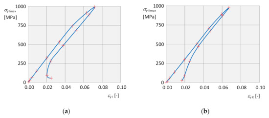 The dependence of the instantaneous maximum normal stress on the corresponding instantaneous strain at the respective isotropic hardening point is shown in Figure 15a, and the dependence on for kinematic hardening in Figure 15b, in both cases for the entire loading cycle. In both dependencies, it is also possible to clearly identify residual normal stresses , and residual strains , due to plastic deformation after the end of loading.