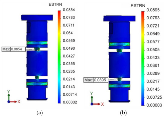 The field of equivalent von Mises strains for isotropic hardening is shown in Figure 18a, and the field of equivalent von Mises strains for kinematic hardening in Figure 18b. At the same time, the locations and magnitudes of extreme values and of these deformations are identified.